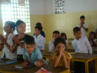 Les méthodes à vrai dire de notre professeur sont un peu désuètes et nous lui avons apporté de nouveaux livres "tous ensemble" qui ont été rédigés par le ministère de l'éducation khmer soutenu par le ministère de l'éducation français.