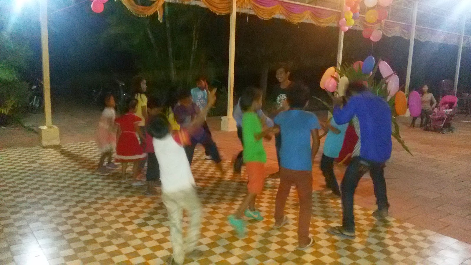 Au menu: curry de poulet, nouilles, poulet frit, pain, fruits et desserts variés. Le directeur a expliqué que le repas était offert par MW. Le représentant des enfants, Rong Reach, a remercié MW pour le repas et la fête. Ensuite, il y eut musique et danse.